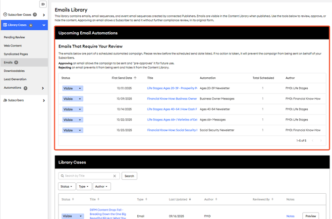 The Emails Library is the central location for reviewing and approving global email automations. The library contains single emails, email sequences, and event sequences created by connected Publishers. Once emails are approved here, they become visible in the Content Library and can be sent by subscribers without further compliance review. It's crucial to understand that approvals on this page are global; if no action is taken—meaning no email approvals are granted—the automation will not send for your subscribers.