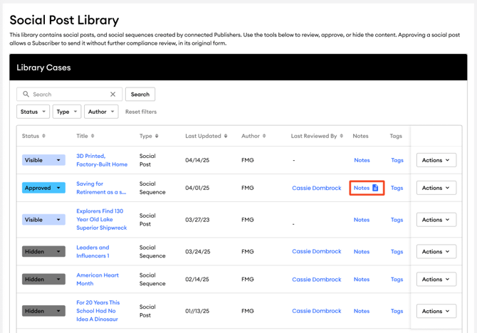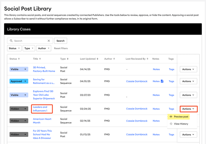 The Social Compliance Library is a dedicated space where you can review, approve, or hide social media content created by connected Publishers. This feature is an integral part of the FMG Compliance Workspace and is designed to enhance the compliance review process.