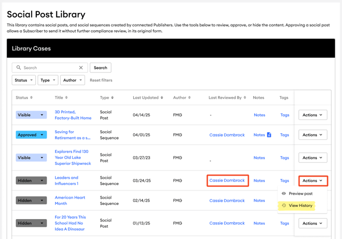 The Review History feature provides a complete audit trail of compliance status changes for all social content. This ensures transparency and accountability, allowing you to track any modifications made over time. You can access the review history by: