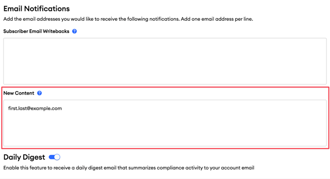Compliance teams can be notified of new content through email notifications. To set this up, navigate to the "Settings" page by clicking on your username in the upper right corner. Under the "Email Notifications" section, add the appropriate email addresses in the "New Content" area to ensure that all relevant team members receive alerts when new social posts or sequences are published.